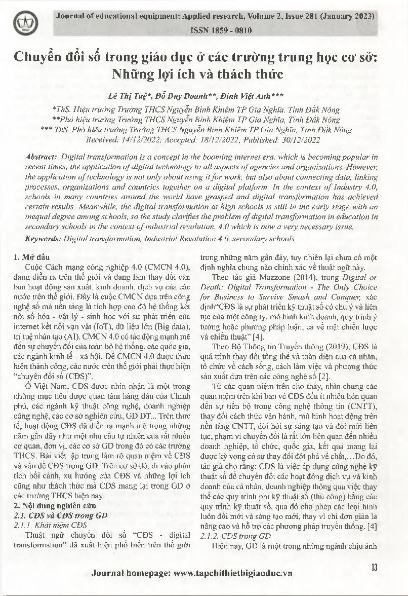 Chuyển đổi số trong giáo dục ở các trường trung học cơ sở: Những lợi ích và thách thức = Digital transformation in education in secondary schools: Benefits and challenges