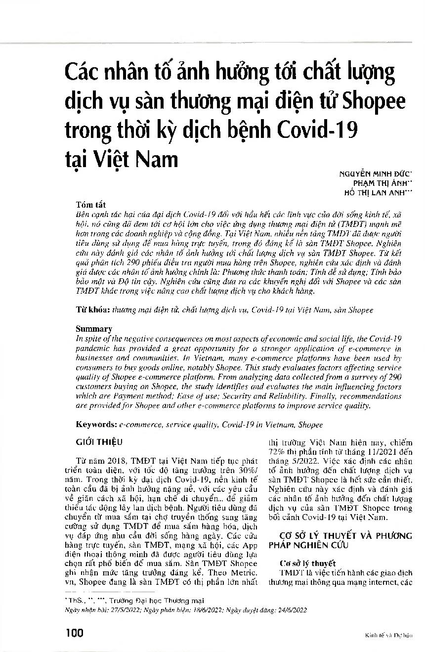 Các nhân tố ảnh hưởng tới chất lượng dịch và sàn thương mại điện tử Shopee trong thời kỳ dịch bệnh Covid-19 tại Việt Nam = Factors affecting service quality of Shopee e-commerce platform during the Covid-19 pandemic in Vietnam