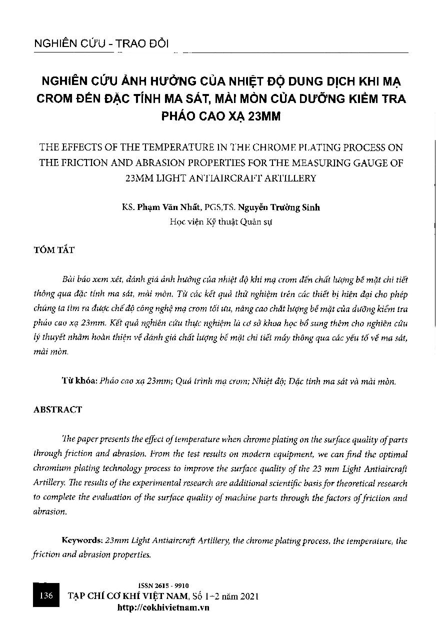 Nghiên cứu ảnh hưởng của nhiệt độ dung dịch khi mạ crom đen đặc tính ma sát, mài mòn của dưỡng kiểm tra pháo cao xạ 23mm = The effects of the temperature in the chrome plating process on the friction and abrasion properties for the measuring gauge of 23mm light antiaircraft artillery