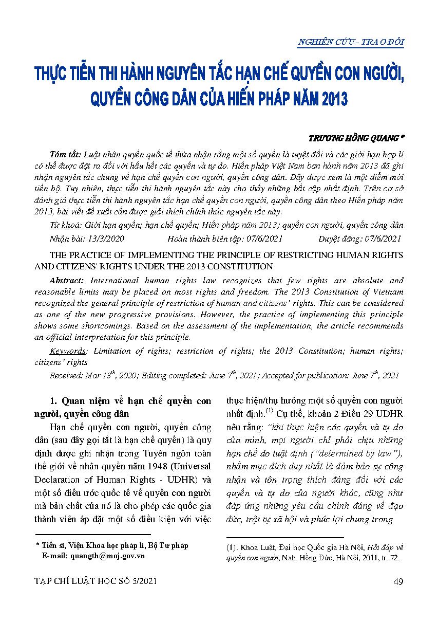 Thực tiễn thi hành nguyên tắc hạn chế quyền con người, quyền công dân của Hiến pháp năm 2013 = The practice of implementing the principle of restricting human rights and citizens' rights under the 2013 Constitutio