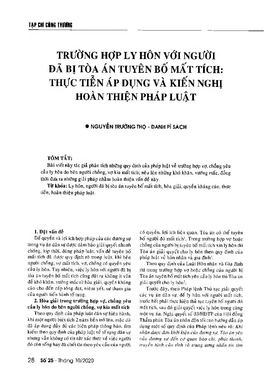 Trường hợp ly hôn với người đã bị tòa án tuyên bố mất tích - Thực tiễn áp dụng và kiến nghị hoàn thiện pháp luật = Divorcing a spouse who have been declared missing by the court: Pracital enforcement and recommendations to perfect related legal provisions
