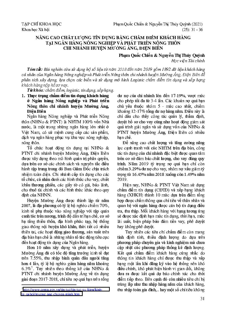 Nâng cao chất lượng tín dụng bằng chấm điểm khách hàng tại Ngân hàng Nông nghiệp và Phát triển Nông thôn chi nhánh huyện Mường Ảng, Điện Biên = Enhancing the credit service quality via customer scoring at Muong Ang branch (Điện Biên) of agribank