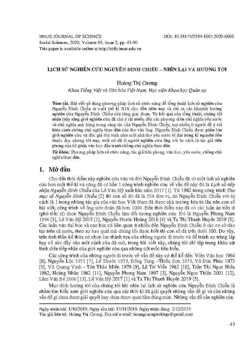Lịch sử nghiên cứu Nguyễn Đình Chiểu - nhìn lại và hướng tới = Literature review of research on Nguyen Dinh Chieu – looking back and forward