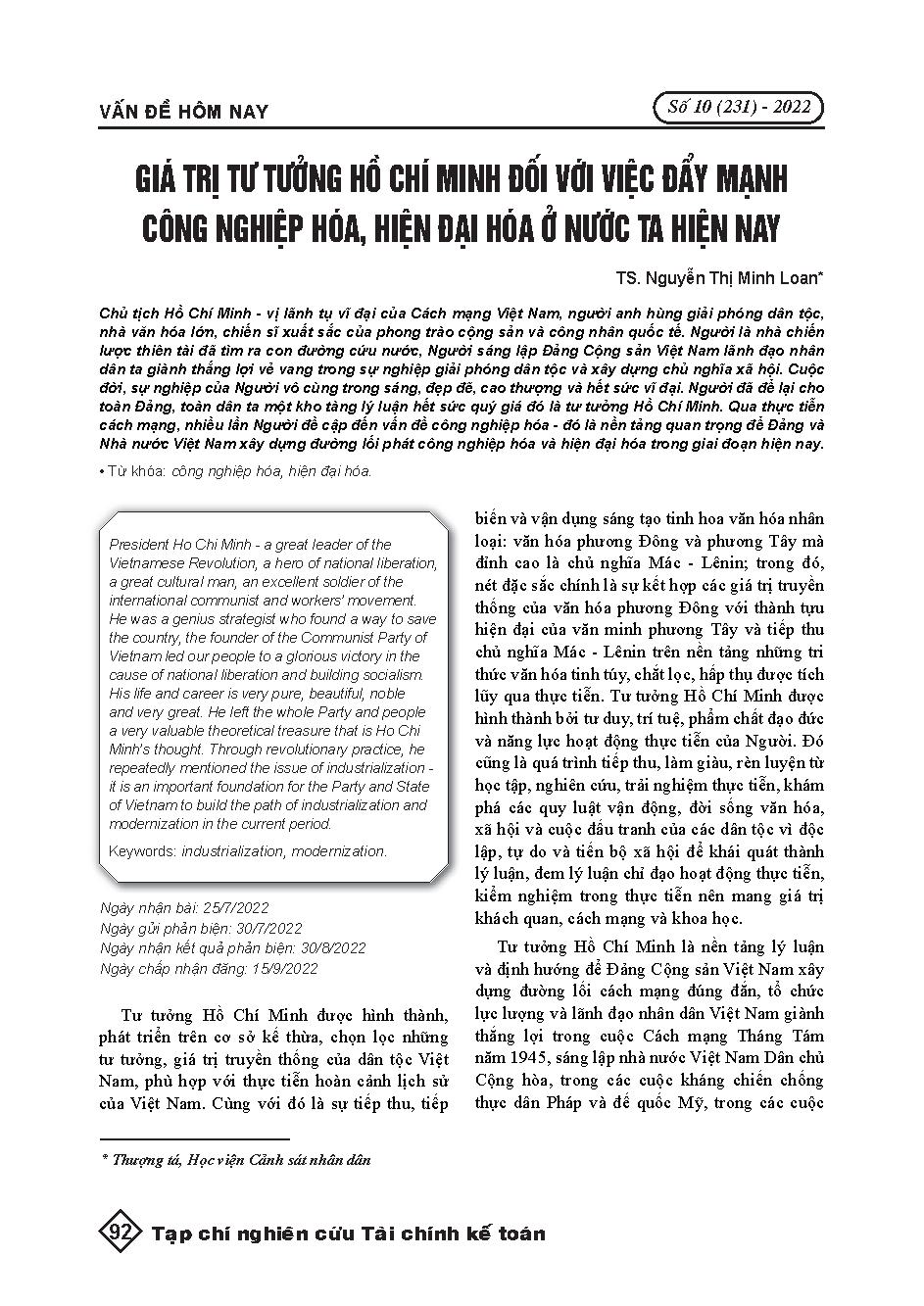 Giá trị tư tưởng Hồ Chí Minh đối với việc đẩy mạnh công nghiệp hóa, hiện đại hóa ở nước ta hiện nay = The value of Ho Chi Minh’s ideology for the promotion of industrialization and modernization in Vietnam