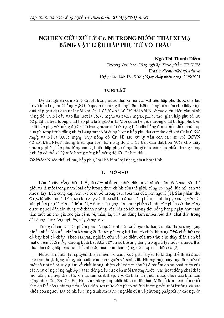 Nghiên cứu xử lý cr, ni trong nước thải xi mạ bằng vật liệu hấp phụ từ vỏ trấu = Removal of cr, nr from plating wastewater by adsorption using rise husks