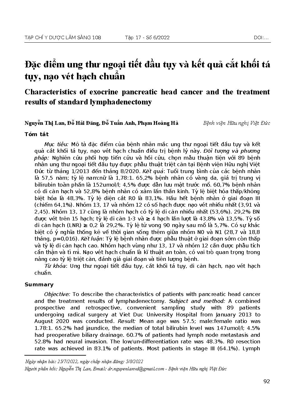 Đặc điểm ung thư ngoại tiết đầu tụy và kết quả cắt khối tá tụy, nạo vét hạch chuẩn = Characteristics of exocrine pancreatic head cancer and the treatment results of standard lymphadenectomy