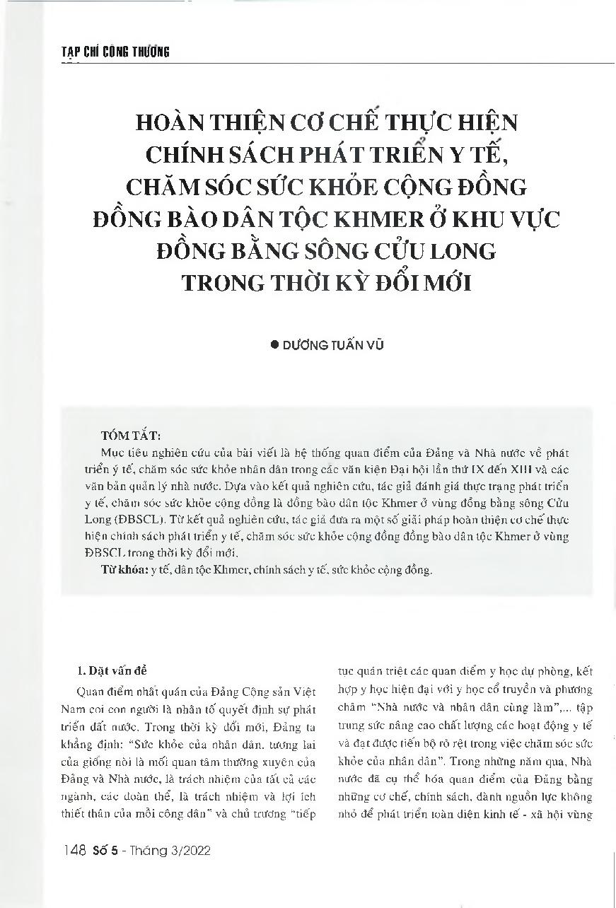 Hoàn thiện cơ chế thực hiện chính sách phát triển y tế, chăm sóc sức khỏe cộng đồng đồng bào dân tộc Khmer ở khu vực Đồng bằng sông Cửu Long trong thời kỳ đổi mới = Improving the implementation of healthcare and public health development policies for Khme
