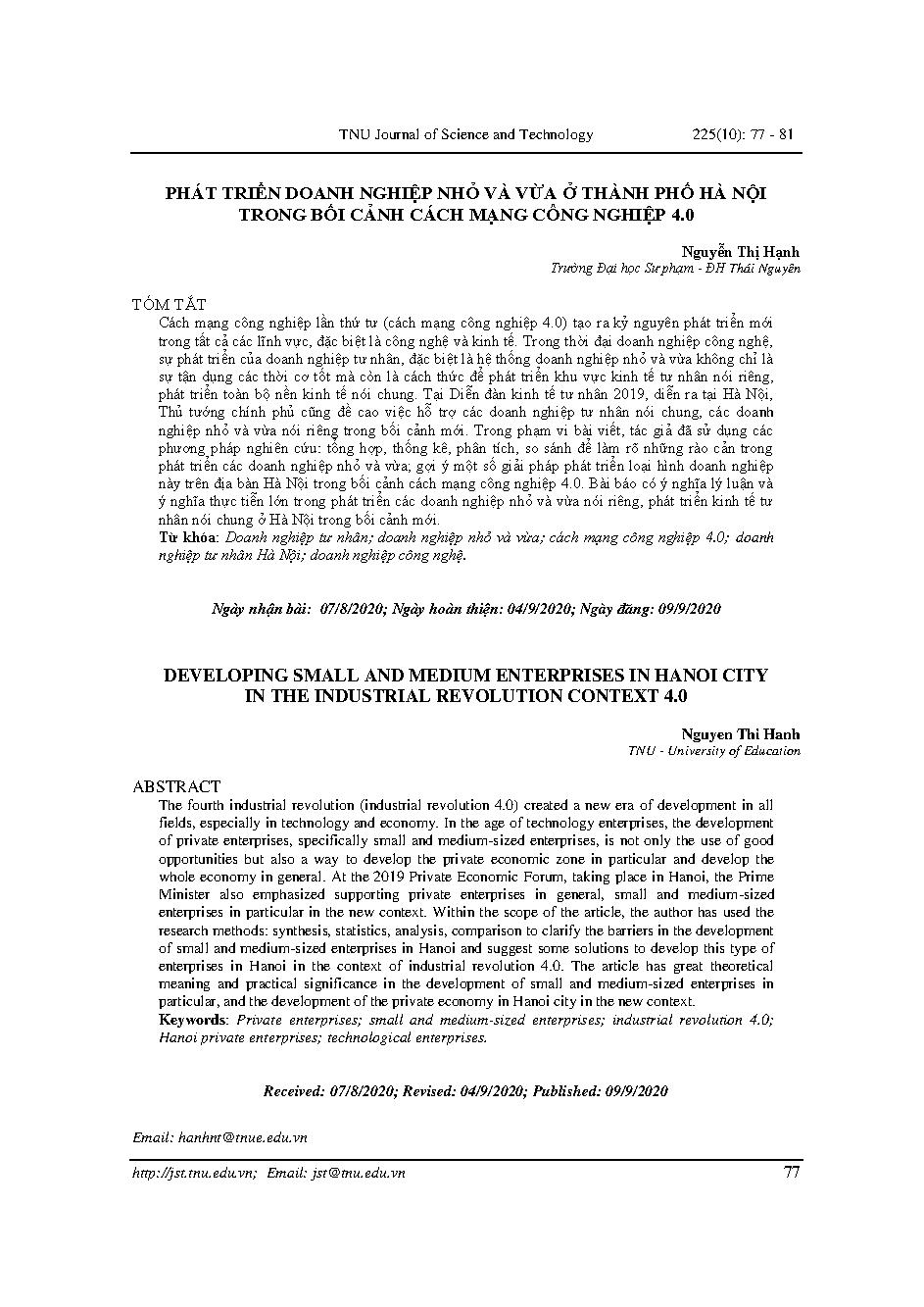 Phát triển doanh nghiệp nhỏ và vừa ở thành phố Hà Nội trong bối cảnh cách mạng công nghiệp 4.0 = Developing small and medium enterprises in Hanoi city in the industrial revolution context 4.0