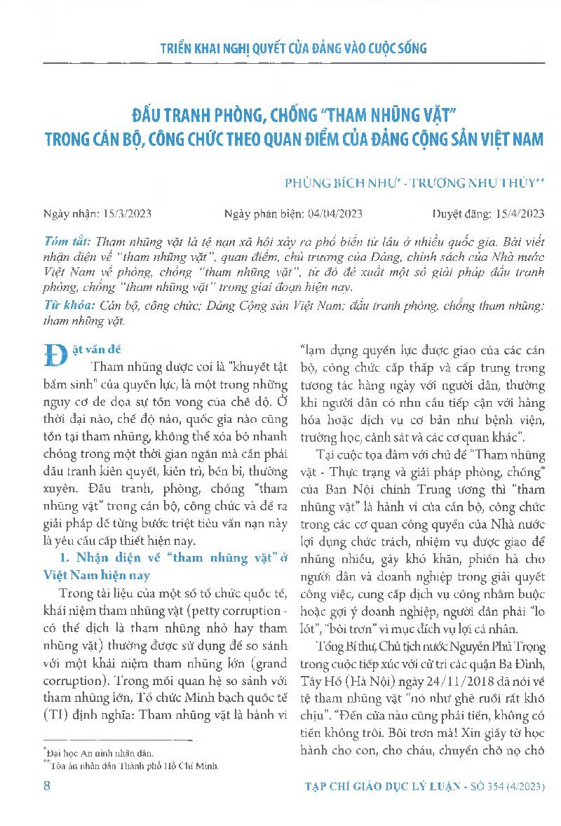 Đấu tranh phòng, chống "tham nhũng vặt" trong cán bộ, công chức theo quan điểm của Đảng Cộng sản Việt Nam = Fighting against "petty corruption" among cadres and civil servants from the perspective ofthe Communist Party of Vietnam