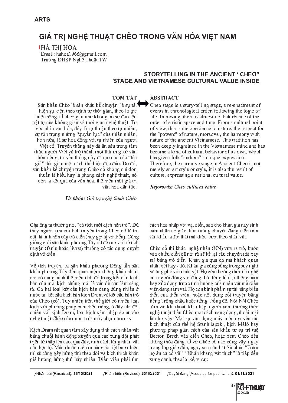 Giá trị nghệ thuật chèo trong văn hóa Việt Nam = Storytelling in the ancient “cheo” stage and Vietnamese cultural value inside