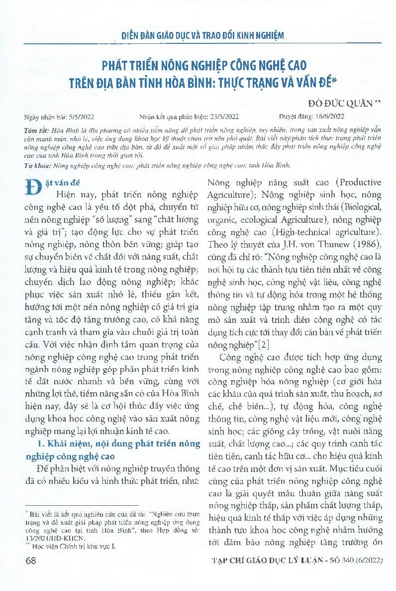 Phát triển nông nghiệp công nghệ cao trên địa bàn tỉnh Hòa Bình: thực trạng và vấn đề