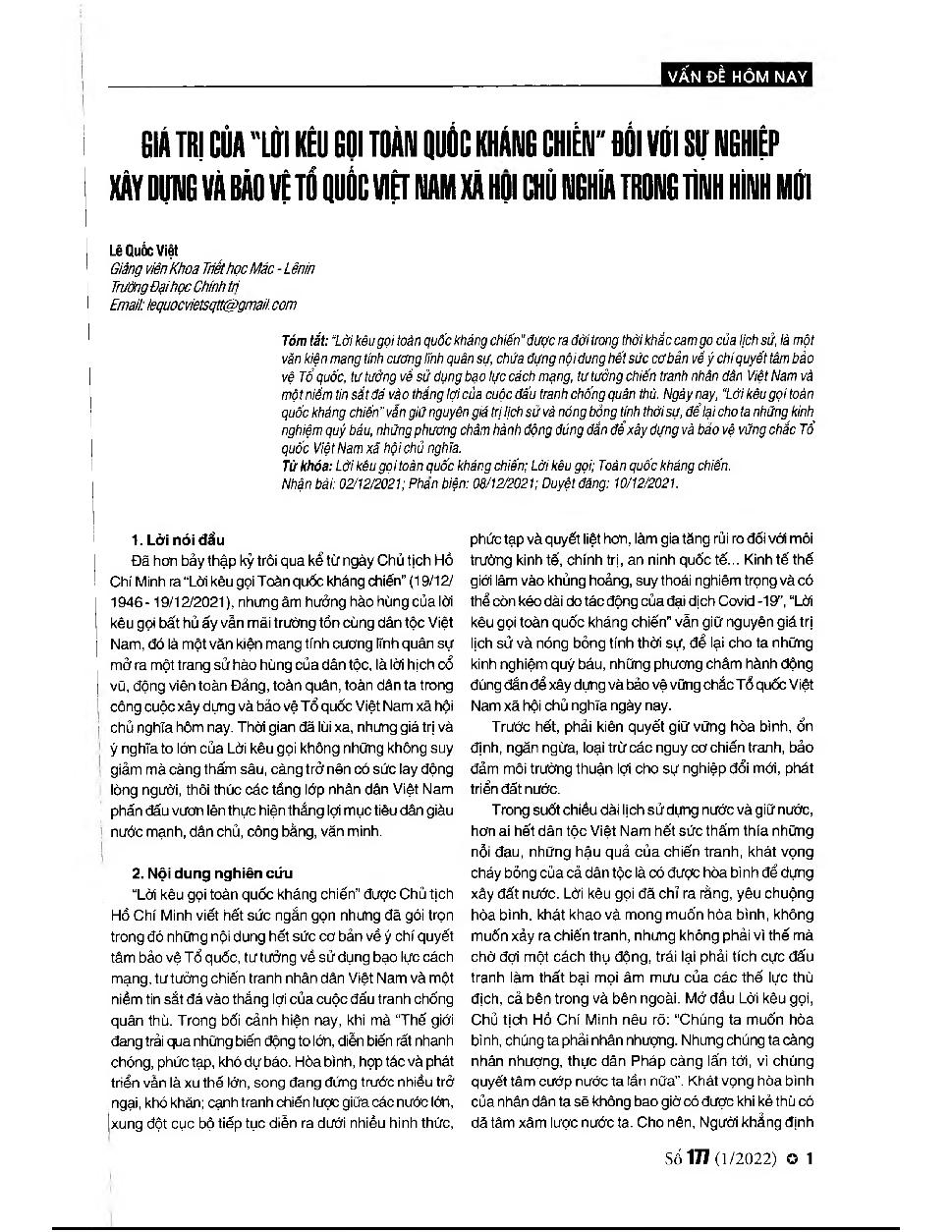 Giá trị của "lời kêu gọi toàn quốc kháng chiến” đối với sự nghiệp xây dựng và bảo vệ tổ quốc Việt Nam xã hội chủ nghĩa trong tình hình mới = The value of the "call for the national resistance" to the cause of building and defending the Socialist Vietnames