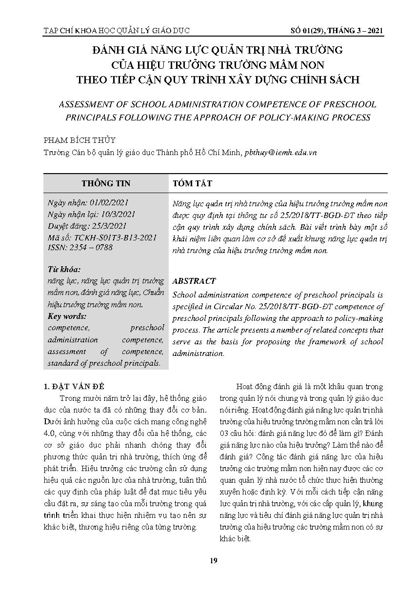 Đánh giá năng lực quản trị nhà trường của hiệu trưởng trường mầm non theo tiếp cận quy trình xây dựng chính sách = ASSESSMENT OF SCHOOL ADMINISTRATION COMPETENCE OF PRESCHOOL PRINCIPALS FOLLOWING THE APPROACH OF POLICY-MAKING PROCESS