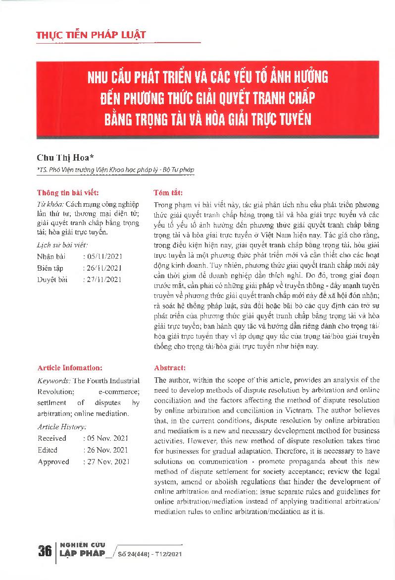Nhu cầu phát triển và các yếu tố ảnh hưởng đến phương thức giải quyết tranh chấp bằng trọng tài và hòa giải trực tuyến = Development needs and factors affecting dispute resolution by online arbitration and mediation