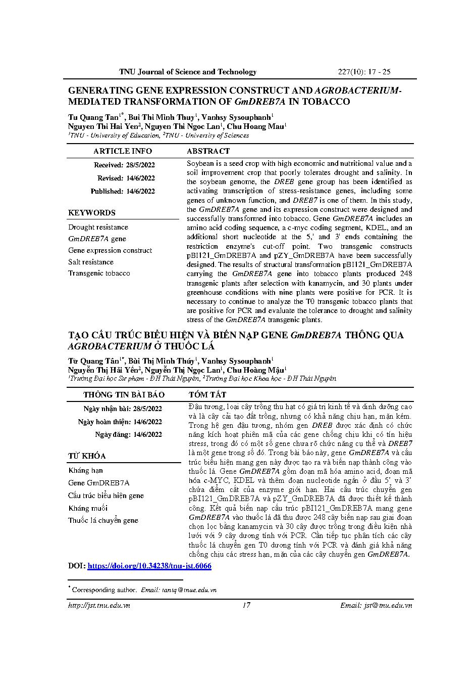 Tạo cấu trúc biểu hiện và biến nạp gene GmDREB7A thông qua agrobacterium ở thuốc lá = Generating gene expression construct and agrobacterium- mediated transformation of gmdreb7a in tobacco
