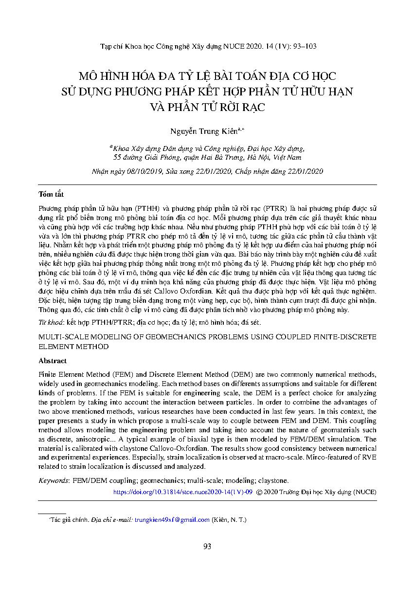 Mô hình hóa đa tỷ lệ bài toán địa cơ học sử dụng phương pháp kết hợp phần tử hữu hạn và phần tử rời rạc = Multi-scale modeling of geomechanics problems using coupled finite-discrete Element method