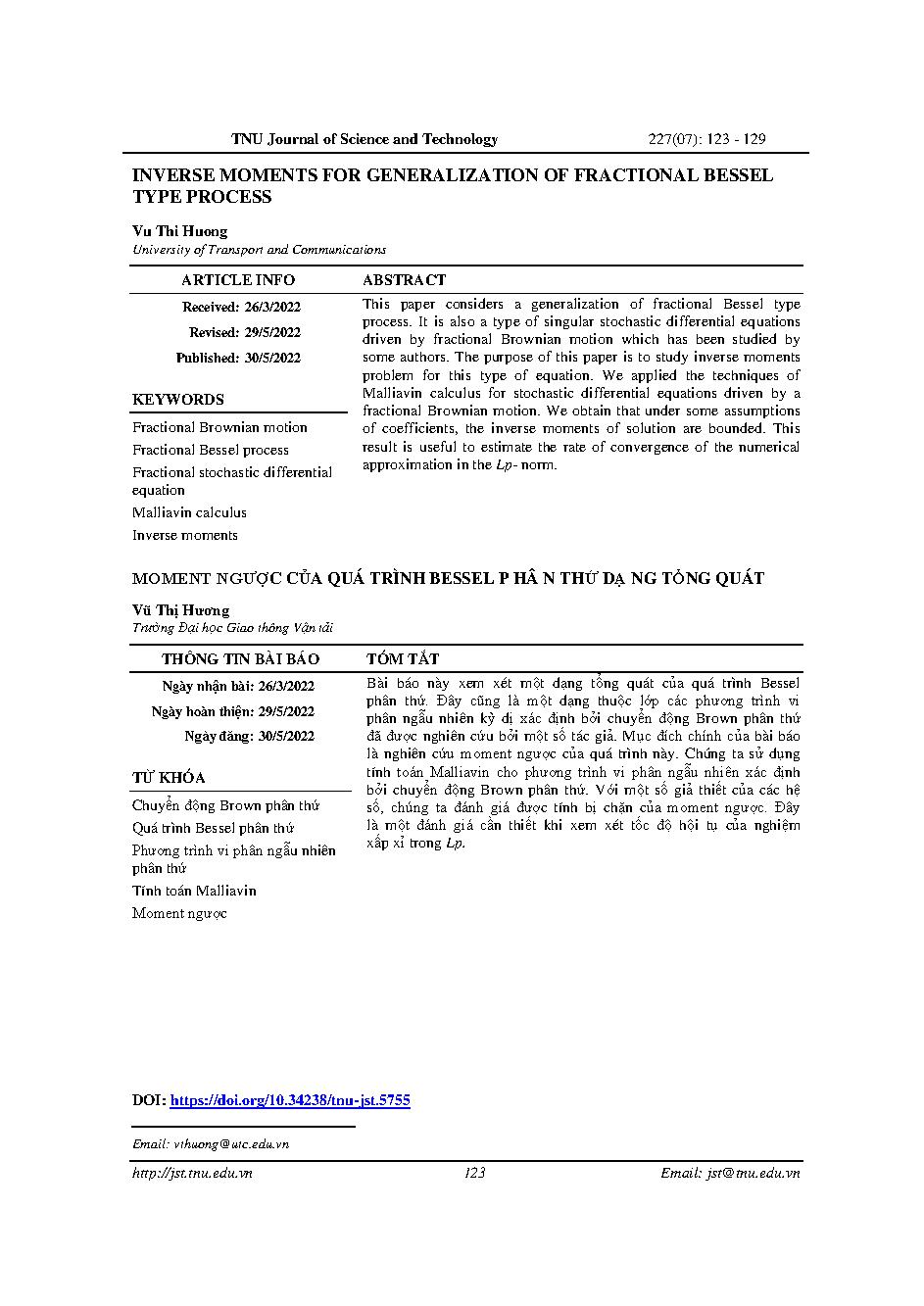Moment ngược của quá trình bessel phân thứ dạng tổng quát = Inverse moments for generalization of fractional bessel type process