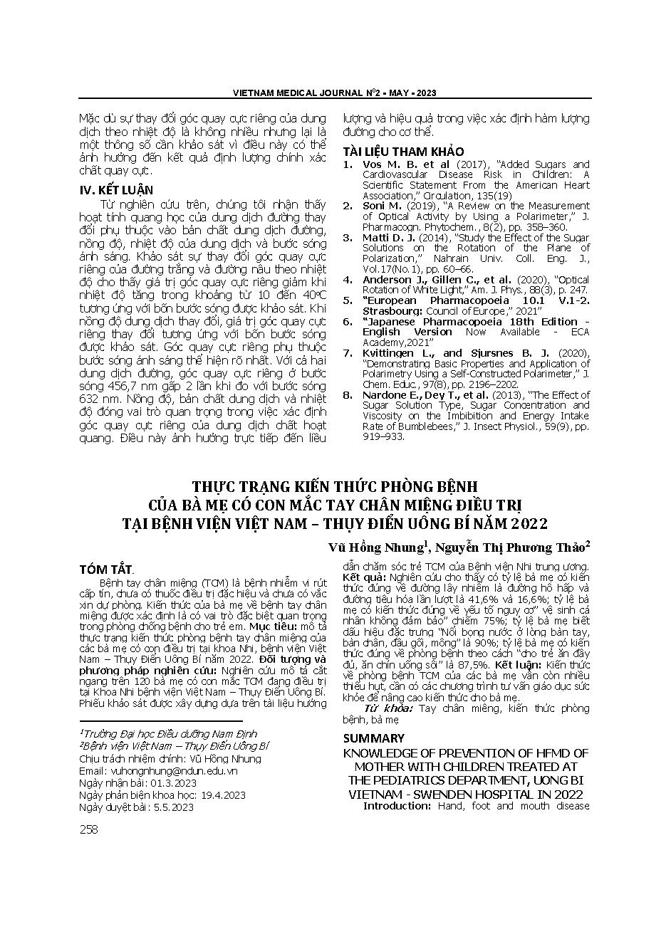 Thực trạng kiến thức phòng bệnh của bà mẹ có con mắc tay chân miệng điều trị tại Bệnh viện Việt Nam - Thụy Điển Uông Bí năm 2022 = Knowledge of prevention of hand, foot and mouth disease of mother with children treated at the pediatrics department, Uong B