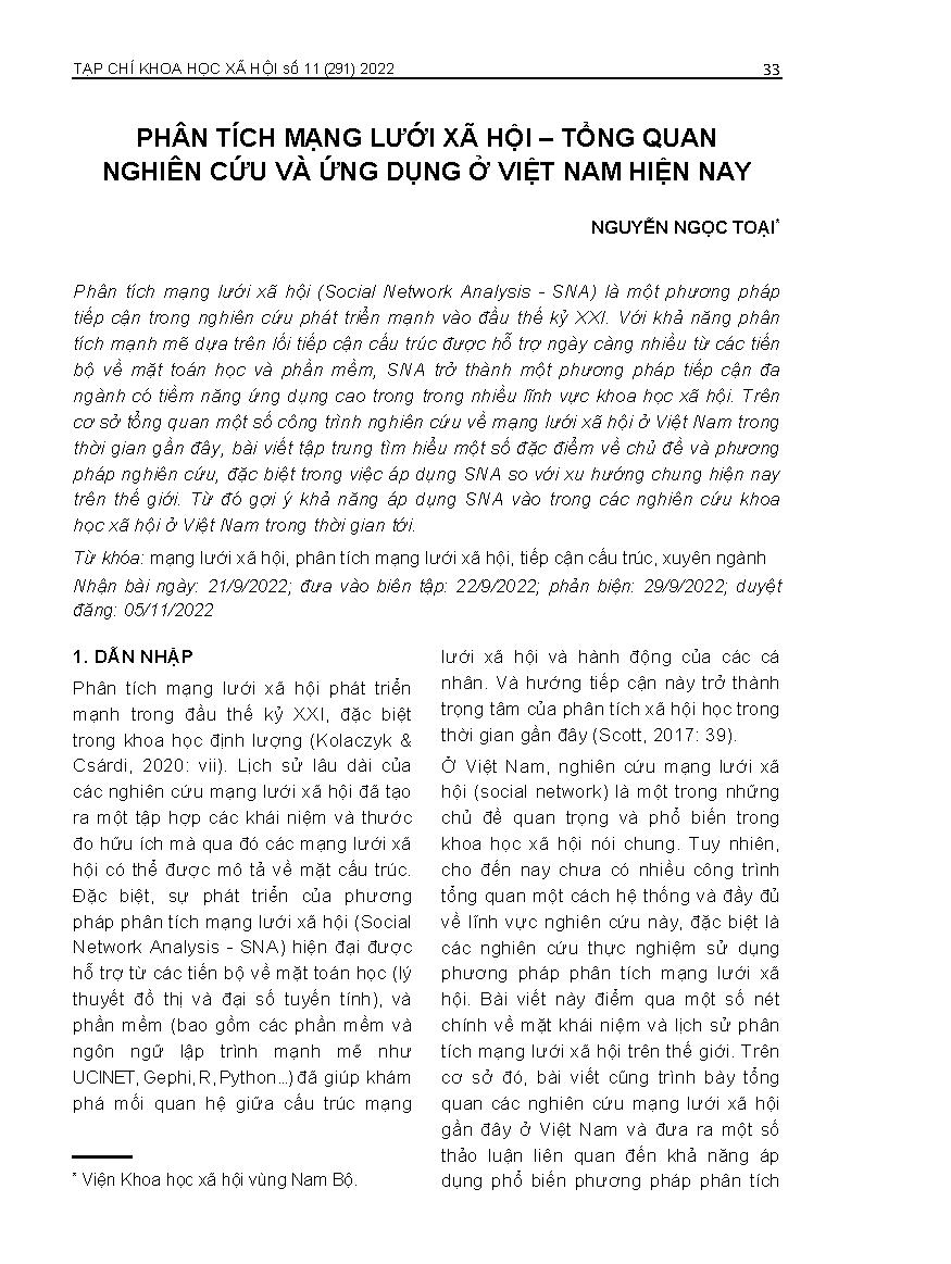 Phân tích mạng lưới xã hội – tổng quan nghiên cứu và ứng dụng ở Việt Nam hiện nay = Social network analysis - An overview of researches and applications in Vietnam
