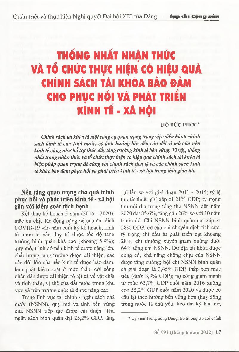 Thống nhất nhận thức và tổ chức thực hiện có hiệu quả chính sách tài khóa bảo đảm cho phục hồi và phát triển kinh tế - xã hội = Unifying awareness and organizing effective implementation of fiscal policies to ensure socio-economic recovery and development