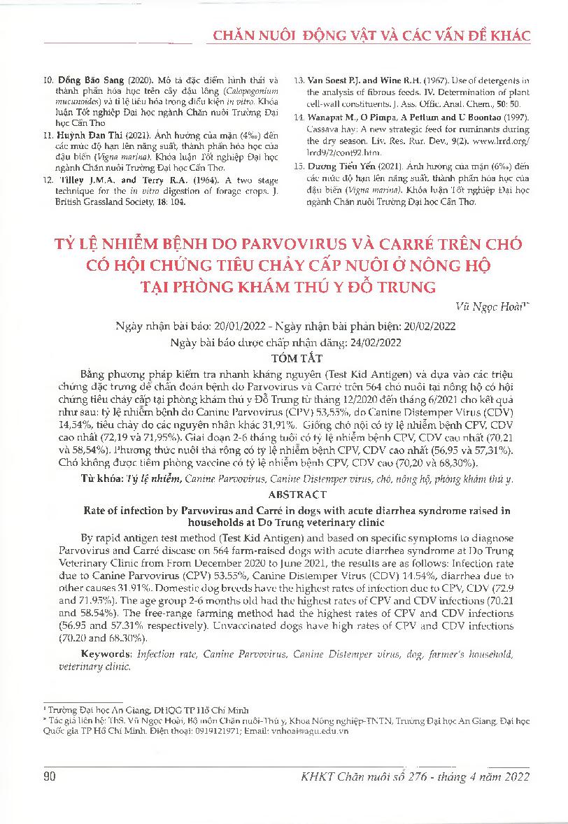 Tỷ lệ nhiễm bệnh do Parvovirus và Carré trên chó có hội chứng tiêu chảy cấp nuôi ở nông hộ tại Phòng khám thú y Đỗ Trung = Rate of infection by Parvovirus and Carré in dogs with acute diarrhea syndrome raised in households at Do Trung veterinary clinic