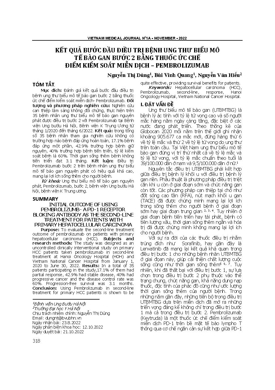 Kết quả bước đầu điều trị bệnh ung thư biểu mô tế bào gan bước 2 bằng thuốc ức chế điểm kiểm soát miễn dịch - Pembrolizumab = Initial outcome of using pembrolizumab - A PD-1 receptor blocking antibody as the second-line treatment for patients with primary