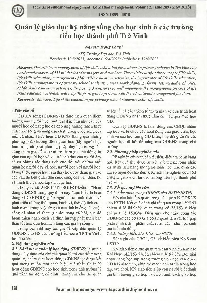 Quản lý giáo dục kỹ năng sống cho học sinh ở các trường tiểu học thành phố Trà Vinh = Management of life skills education for students in primary schools in Tra Vinh city