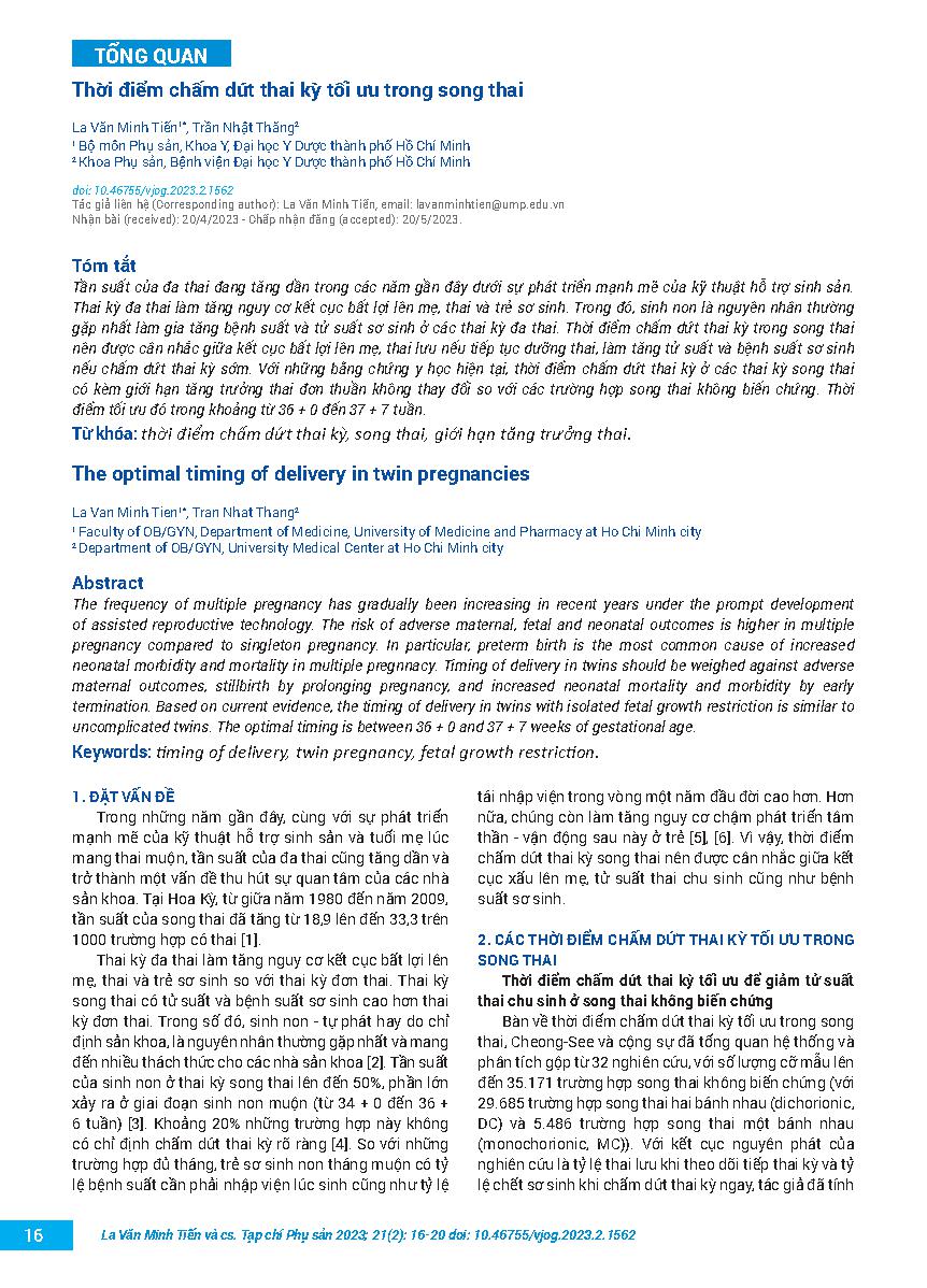 Thời điểm chấm dứt thai kỳ tối ưu trong song thai = The optimal timing of delivery in twin pregnancies