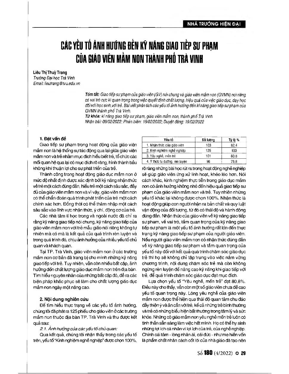 Các yếu tố ảnh hưởng đến kỹ năng giao tiếp sư phạm của giáo viên mầm non thành phố Trà Vinh - = Factors affecting pedagogical communication skills of preschool teachers in Tra Vinh city