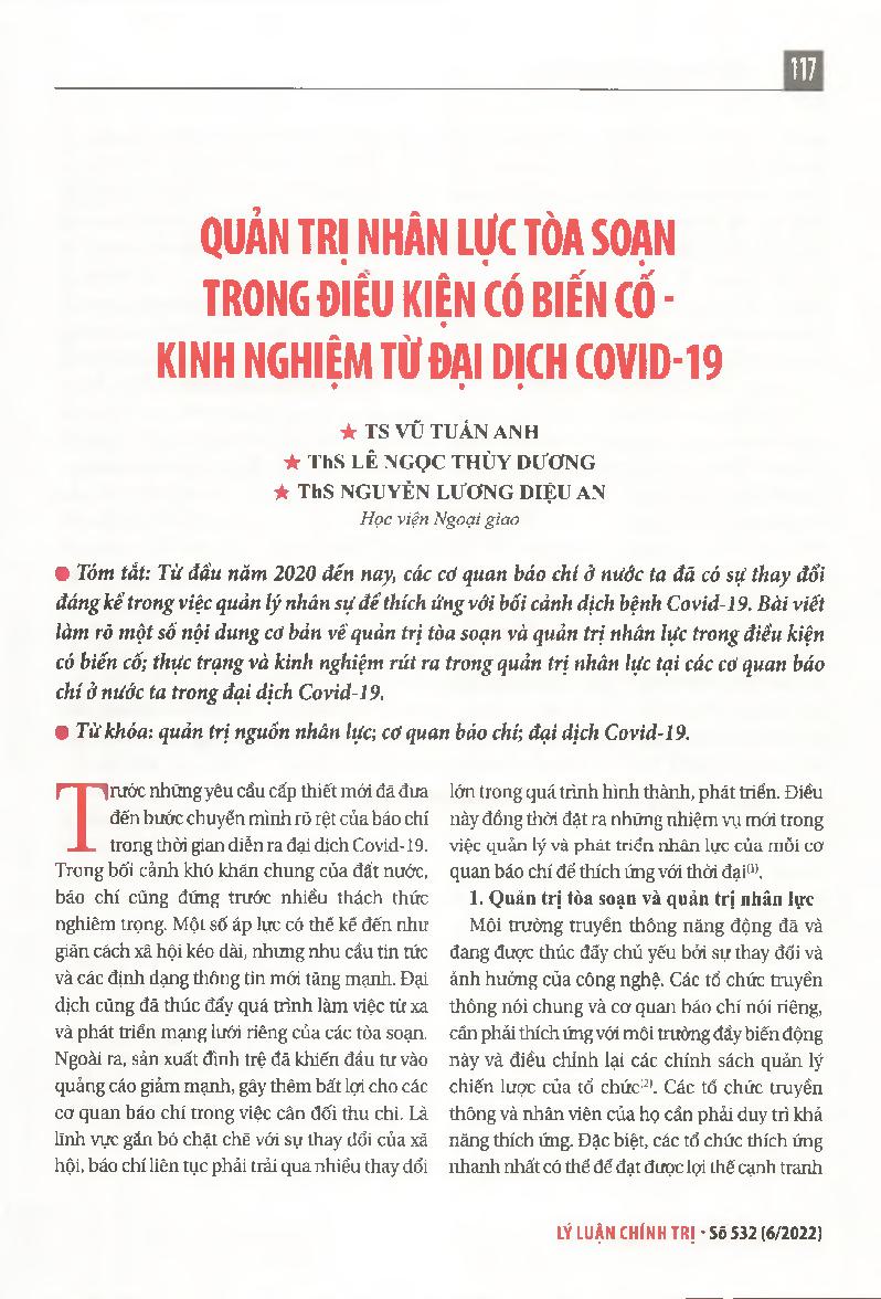 Quản trị nhân lực tòa soạn trong điều kiện có biến cố - kinh nghiệm từ đại dịch Covid-19 = Human resource management in the newsroom in the event of an emergency - experience from the Covid-19 pandemic