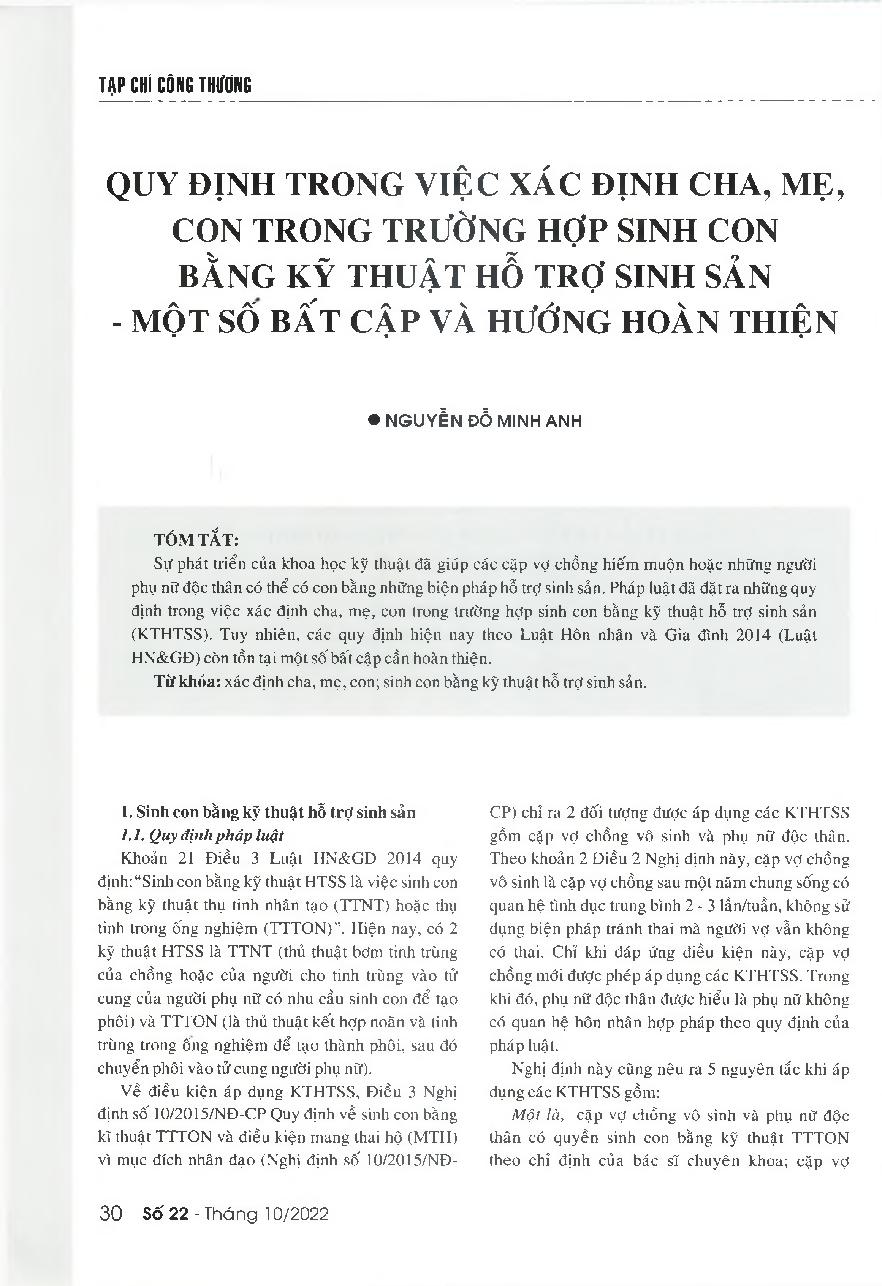 Quy định trong việc xác định cha, mẹ, con trong trường hợp sinh con bằng kỹ thuật hỗ trợ sinh sản - Một số bất cập và hướng hoàn thiện = Regulations regarding the determination of the father, mother and child when giving birth with assisted reproductive t