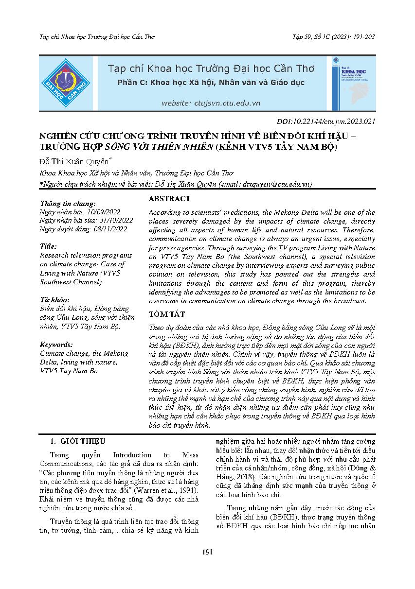 Nghiên cứu chương trình truyền hình về biến đổi khí hậu – trường hợp Sống Với Thiên Nhiên (Kênh VTV5 Tây Nam Bộ) = Research television programs on climate change- Case of Living with Nature (VTV5 Southwest Channel)