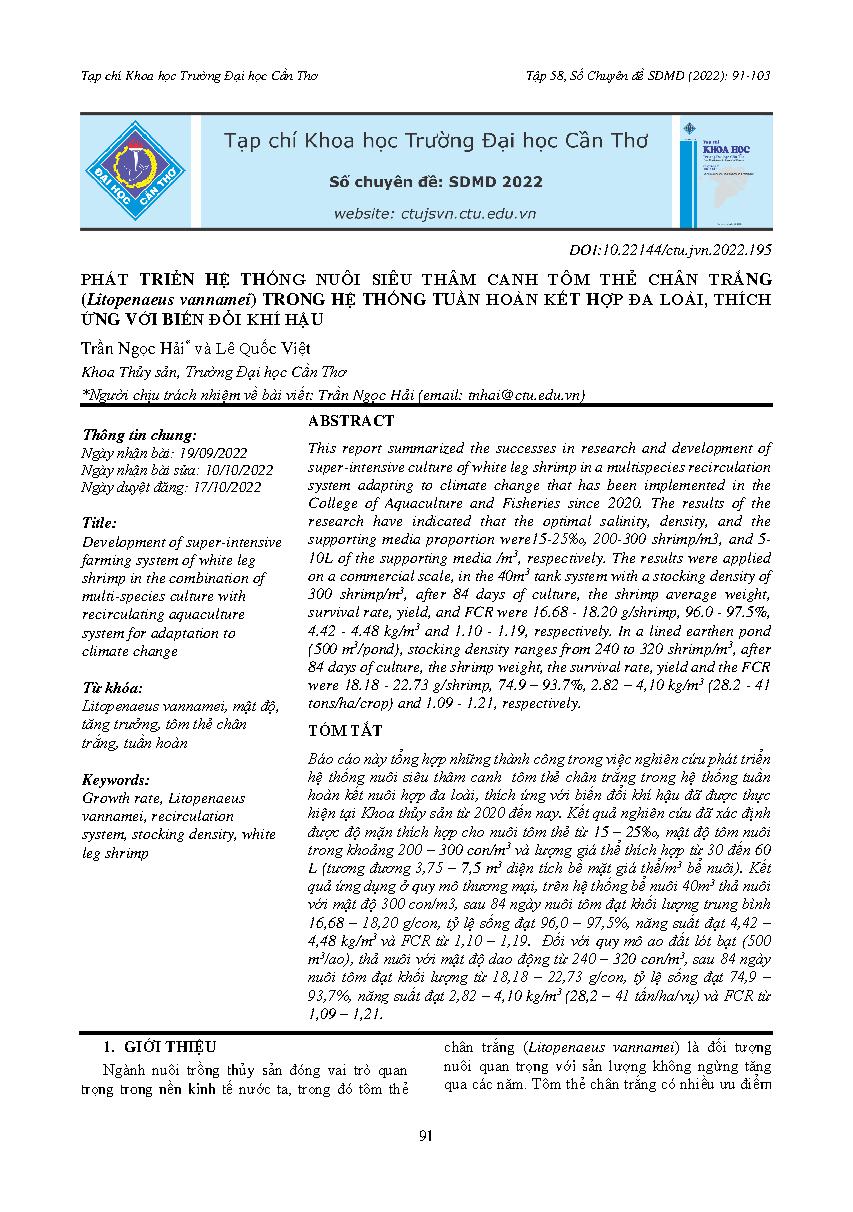 Phát triển hệ thống nuôi siêu thâm canh tôm thẻ chân trắng (Litopenaeus vannamei) trong hệ thống tuần hoàn kết hợp đa loài, thích ứng với biến đổi khí hậu = Development of super-intensive farming system of white leg shrimp in the combination of multi-spec