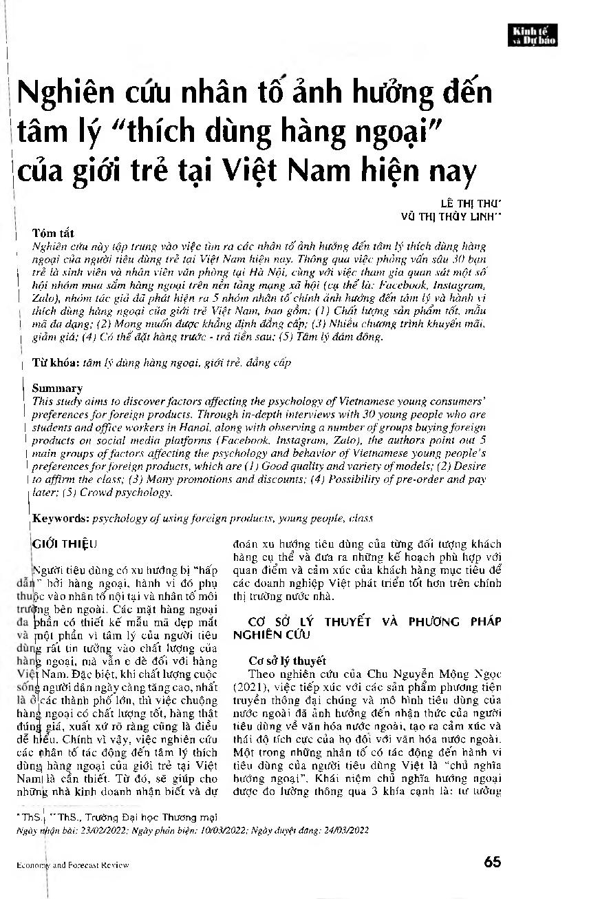 Nghiên cứu nhân tố ảnh hưởng đến tâm lý "thích dùng hàng ngoại” của giới trẻ tại Việt Nam hiện nay = Factors affecting the psychology of Vietnamese young consumers&; 39; preferences for foreign products