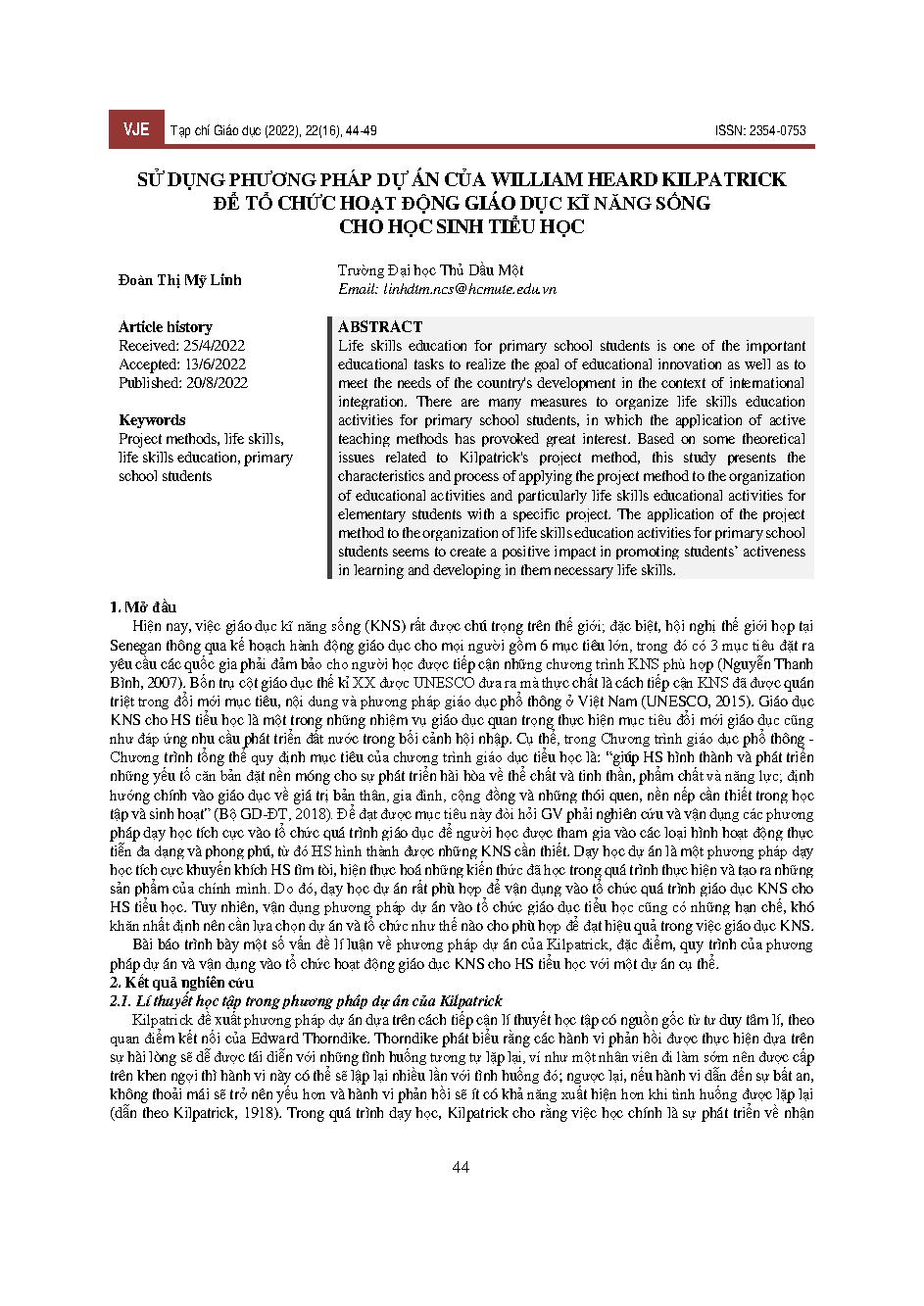 Sử dụng phương pháp dự án của william heard kilpatrick để tổ chức hoạt động giáo dục kĩ năng sống cho học sinh tiểu học = Using the project method of william heard kilpatrick to organize life skills education activities for primary school students