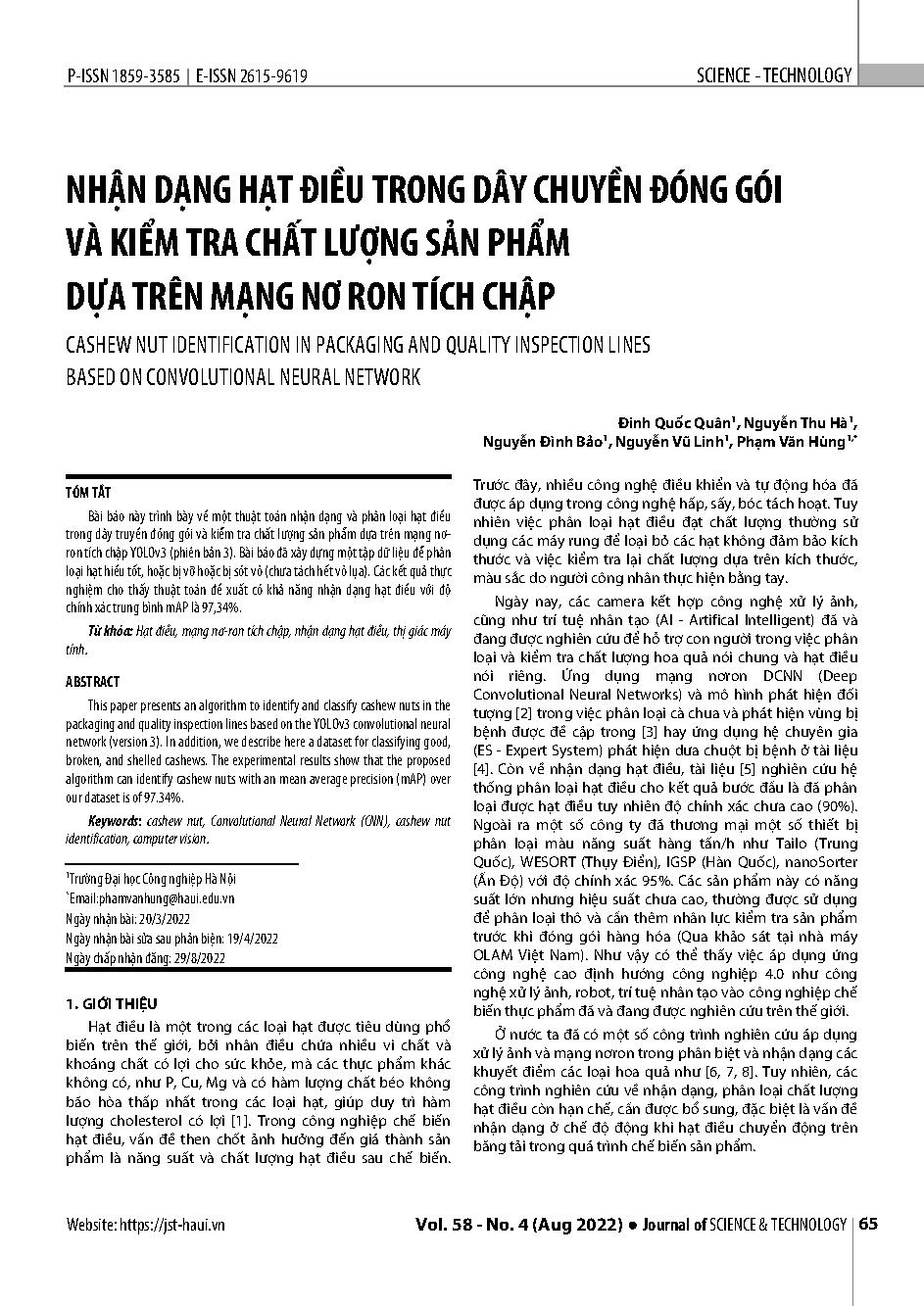 Nhận dạng hạt điều trong dây chuyền đóng gói và kiểm tra chất lượng sản phẩm dựa trên mạng nơ ron tích chập = Cashew nut identification in packaging and quality inspection lines based on convolutional neural network