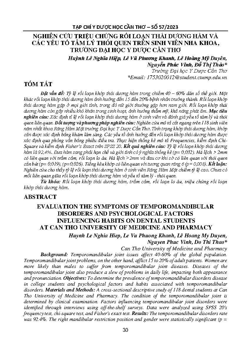 Nghiên cứu triệu chứng rối loạn thái dương hàm và các yếu tố tâm lý thói quen trên sinh viên nha khoa, Trường Đại học Y dược Cần Thơ