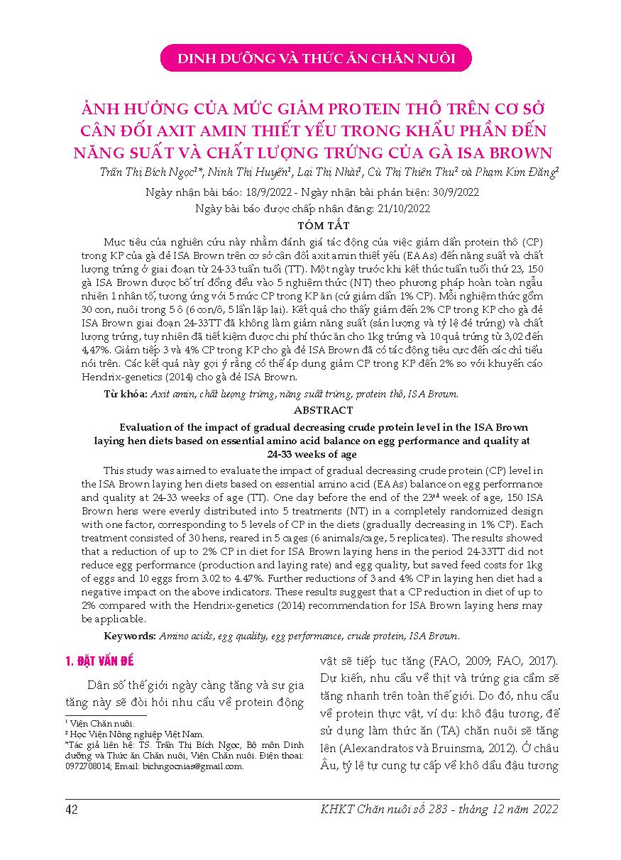 Ảnh hưởng của mức giảm protein thô trên cơ sở cân đối axit amin thiết yếu trong khẩu phần đến năng suất và chất lượng trứng của gà Isa Brown = Evaluation of the impact of gradual decreasing crude protein level in the ISA Brown laying hen diets based on es