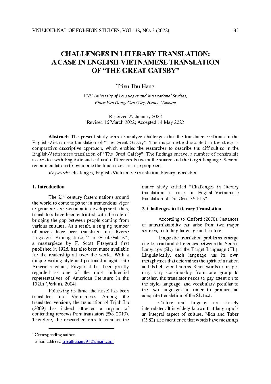 Thách thức trong dịch văn học: Nghiên cứu trường hợp dịch Anh – Việt trong tác phẩm “Đại gia Gatsby” = Challenges in literary translation: A case in English-Vietnamese translation of “The great Gatsby”