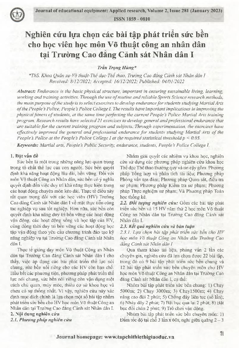 Nghiên cứu lựa chọn các bài tập phát triển sức bền cho học viên học môn Võ thuật công an nhân dân tại Trường Cao đẳng Cảnh sát Nhân dân I = Research on the selection of strength development exercises for students in Martial Arts at the People's Police Col
