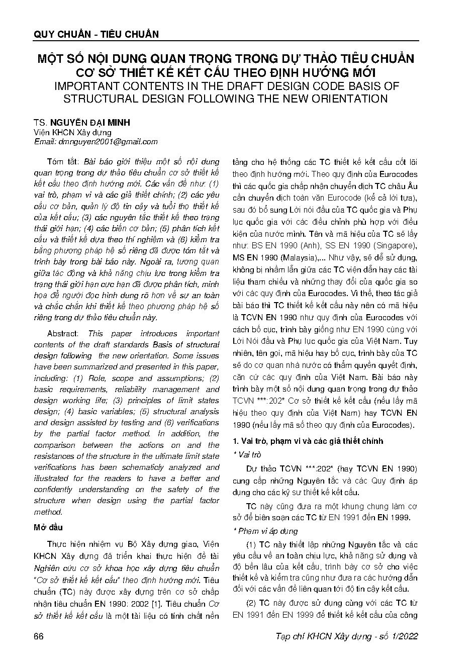 Một số nội dung quan trọng trong dự thảo tiêu chuẩn cơ sở thiết kế kết cấu theo định hướng mới = Important contents in the draft design code basis of structural design following the new orientation
