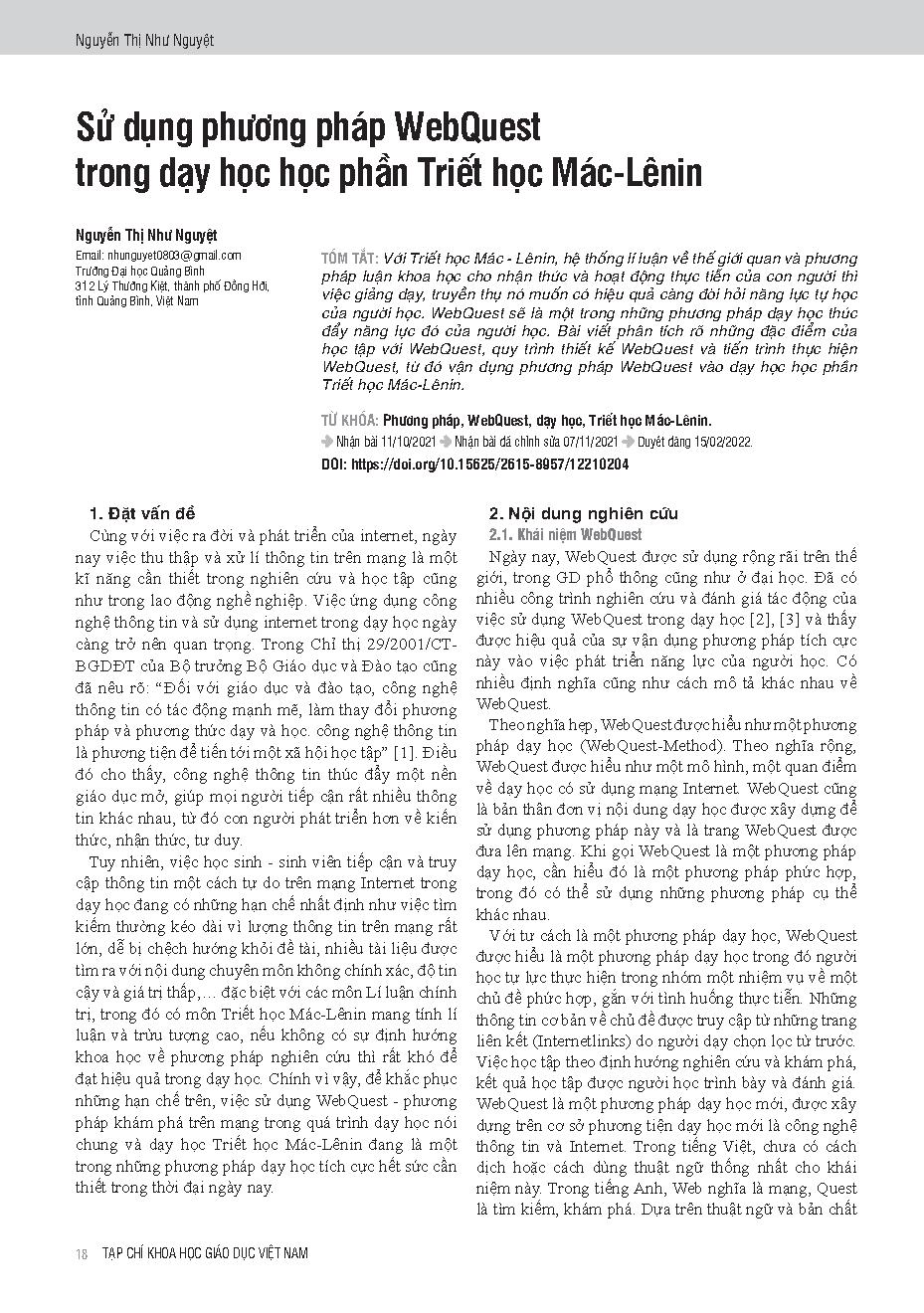 Sử dụng phương pháp WebQuest trong dạy học học phần Triết học Mác-Lênin = Applying the webquest method in teaching the module of marxist-leninist philosophy