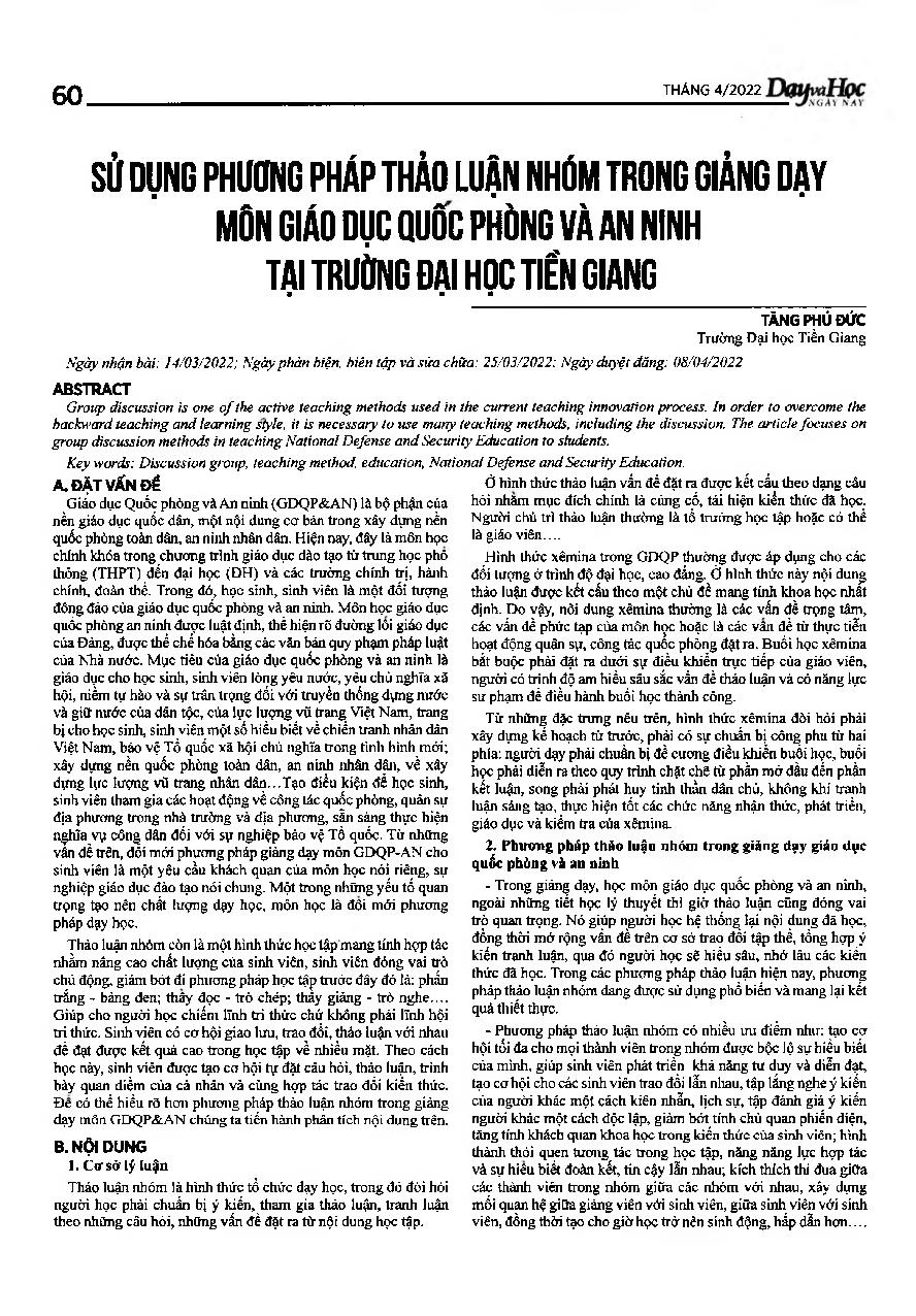 Sử dụng phương pháp thảo luận nhóm trong giảng dạy môn Giáo dục Quốc phòng và An ninh tại Trường Đại học Tiền Giang = Using the group discussion method in teaching National Defense and Security Education at Tien Giang University