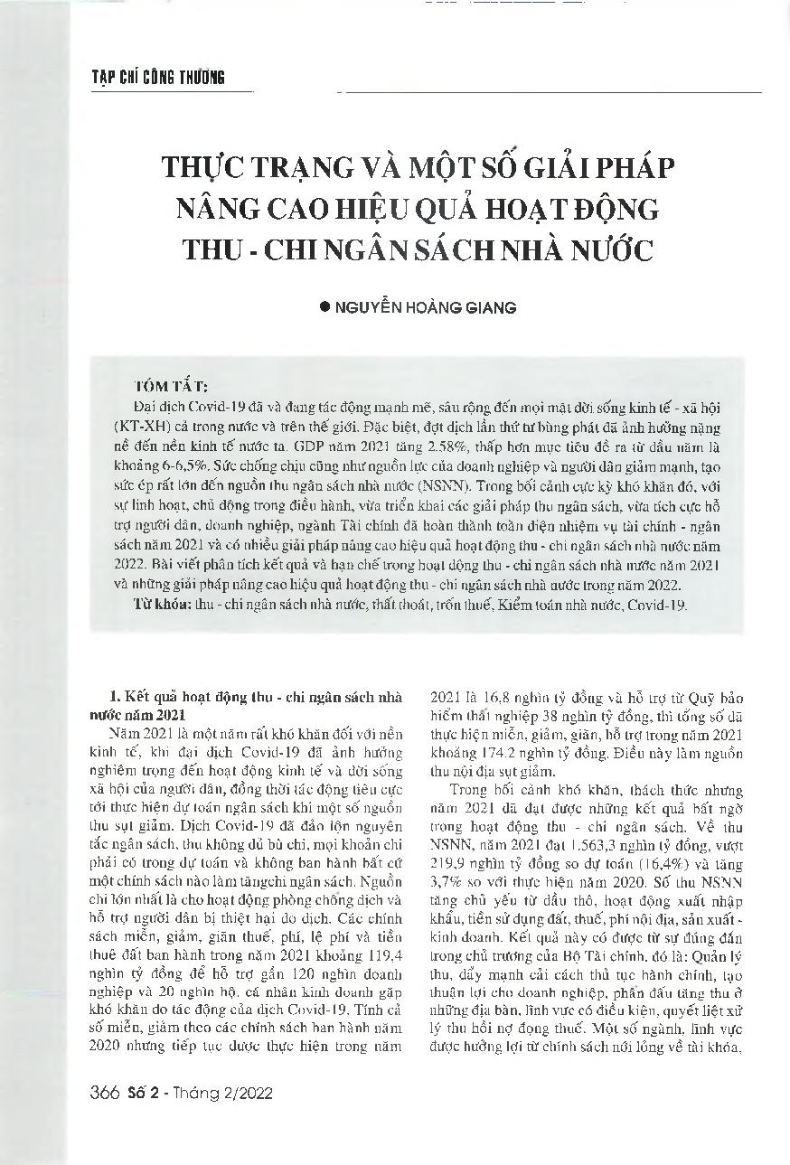 Thực trạng và một số giải pháp nâng cao hiệu quả hoạt động thu - chi ngân sách nhà nước = The current situation and some solutions to improve the management of of state budget revenues and expenditures in Vietnam