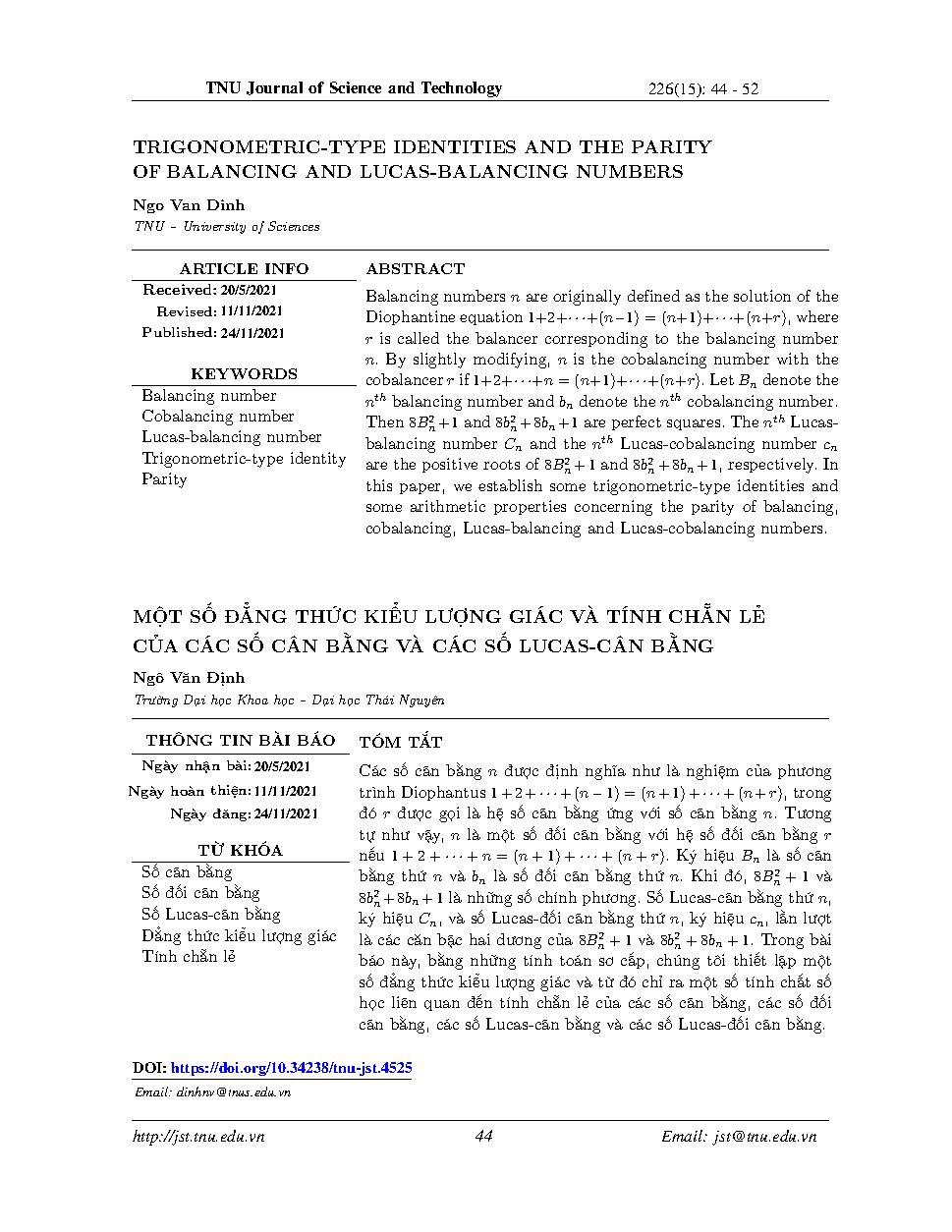 Một số đẳng thức kiểu lượng giác và tính chẵn lẻ của các số cân bằng và các ố Lucas- cân bằng = Trigonometric-type identities and the parity of balancing and lucas-balancing numbers