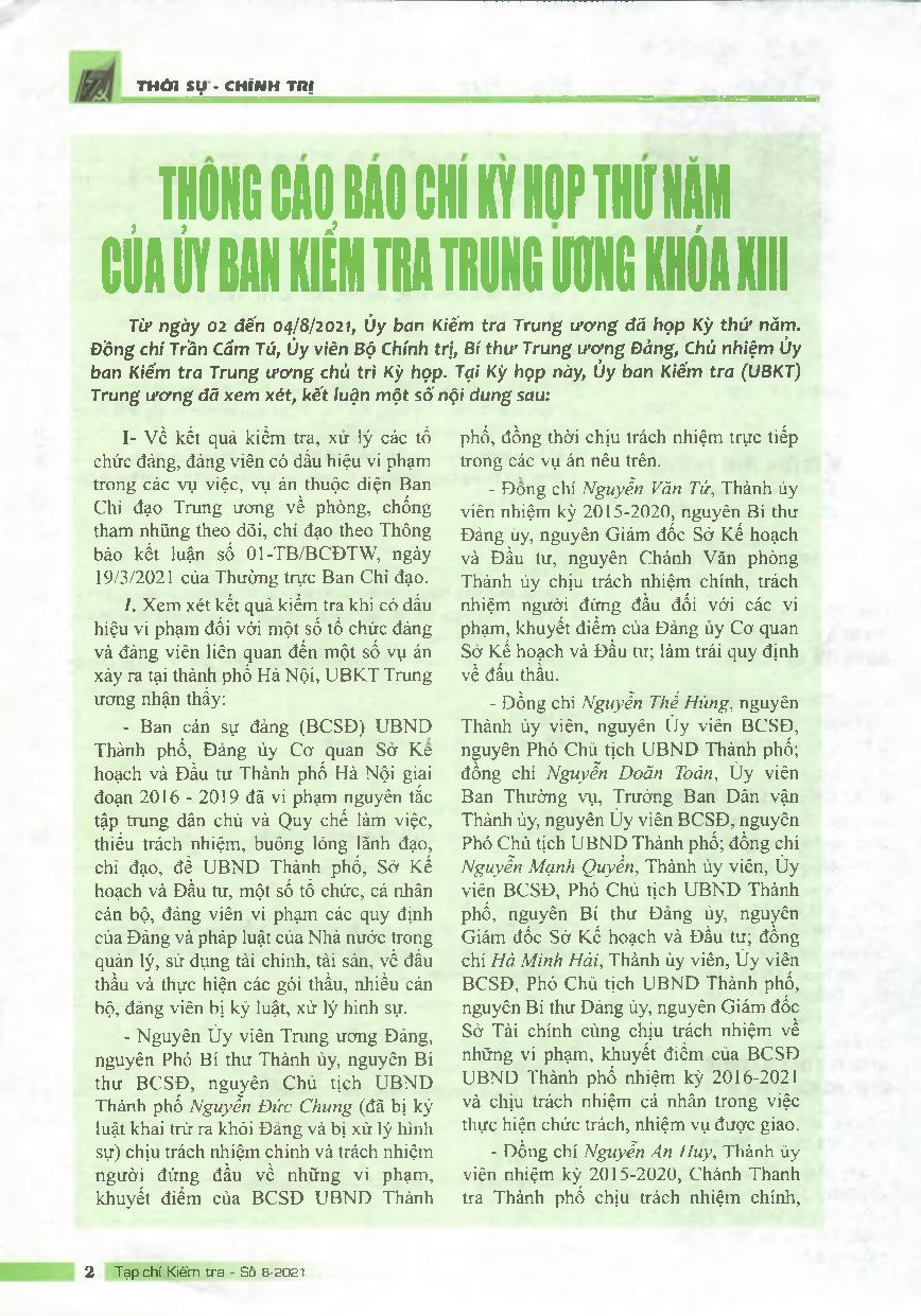 Thông cáo báo chí Kỳ họp thứ năm của UBKT Trung ương khóa XIII