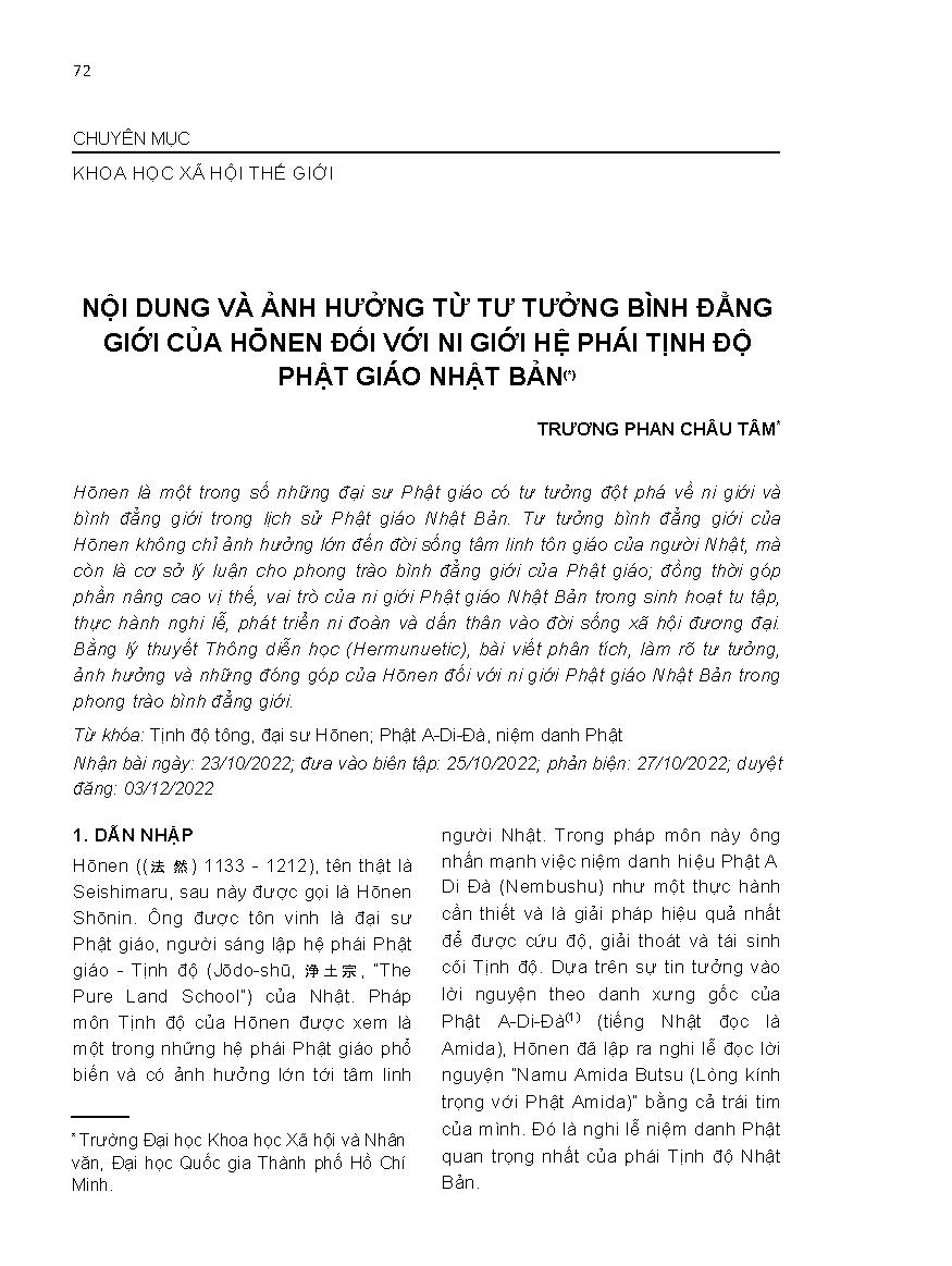 Nội dung và ảnh hưởng từ tư tưởng bình đẳng giới của Hōnen đối với ni giới hệ phái tịnh độ Phật giáo Nhật Bản = Content and influence of Honen&; 39;s Gender equality ideology on Nuns of Japanese Pure Land Buddism