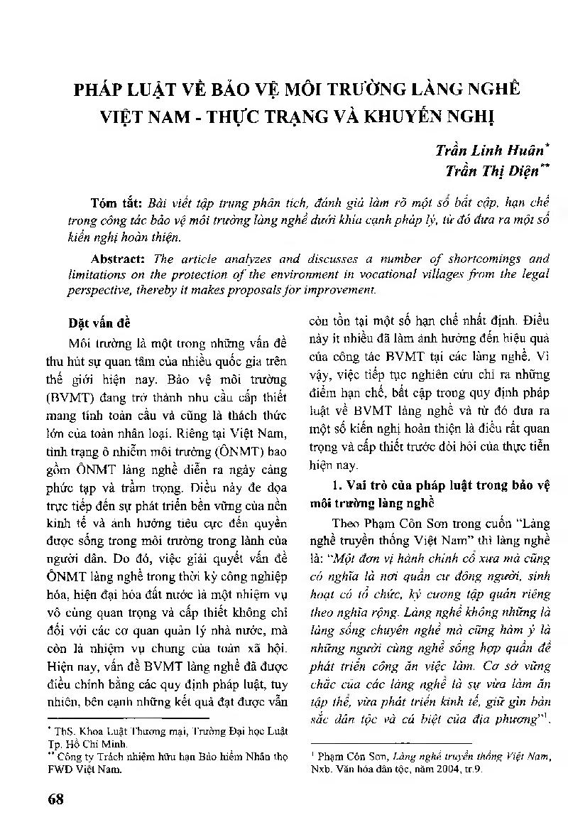 Pháp luật về bảo vệ môi trường làng nghề Việt Nam - thực trạng và khuyến nghị = The Law on Protection of the Environment in Vocational Villages in Viet Nam - Practice and Proposals