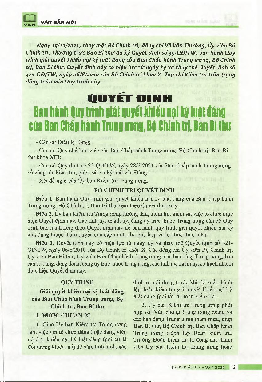 Quyết định số 35-QD/TW, ban hành Quy trình giải quyết khiếu nại kỷ luật đảng của Ban Chấp hành Trung ương, Bộ Chính trị, Ban Bí thư