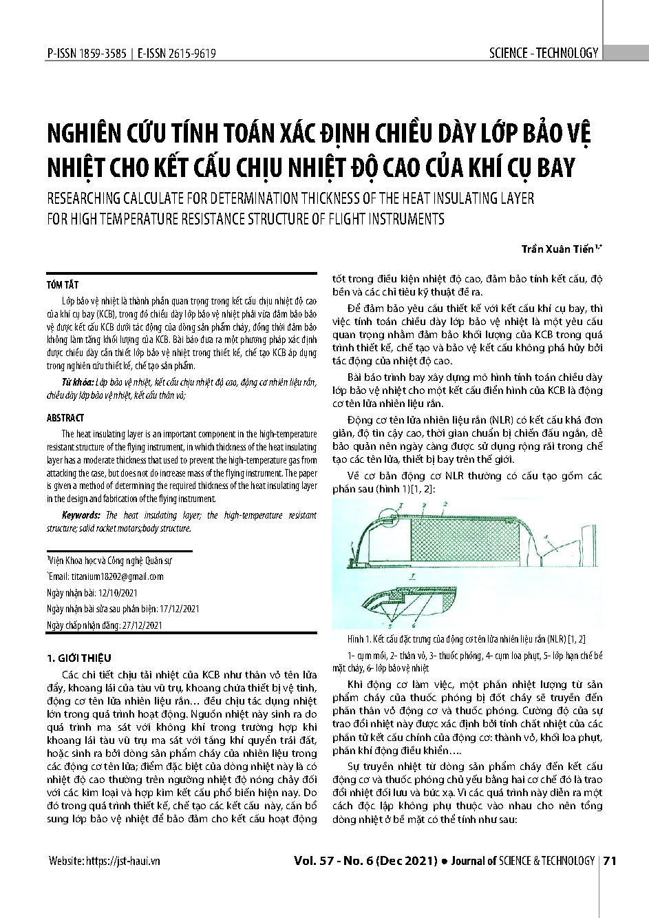 Nghiên cứu tính toán xác định chiều dày lớp bảo vệ nhiệt cho động cơ tên lửa nhiên liệu rắn = Researching calculate for determination thickness of the heat insulating layer for solid propellant fuel rocket